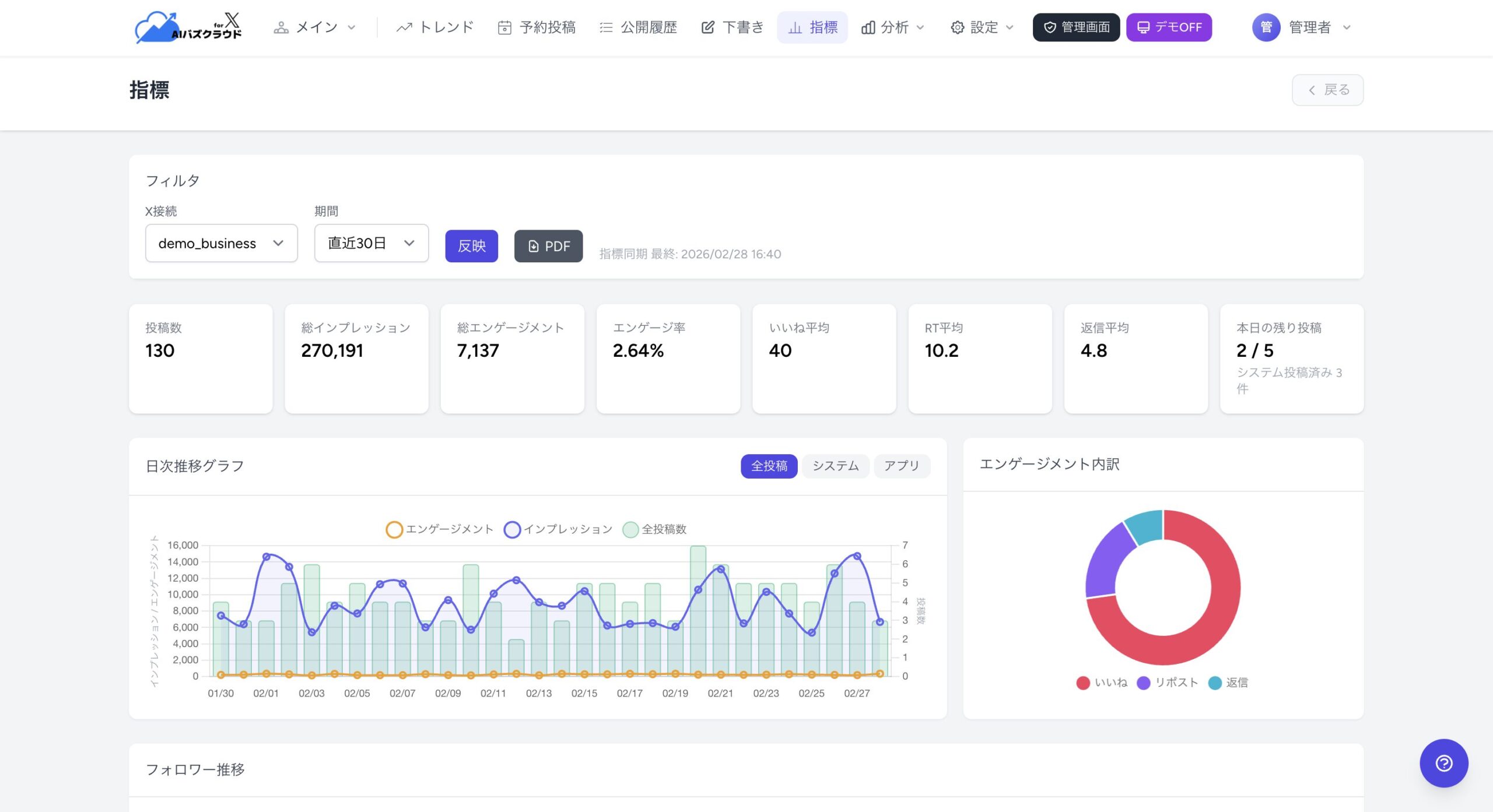 AIバズクラウド for Xは、トレンド取得、投稿生成、配信、分析、改善までを一体化することで、単発の成功ではなく、再現性のある成長モデルを実装します。SNS運用を感覚論からデータドリブンへ転換したいユーザーに向けた、実践的なAI基盤です。