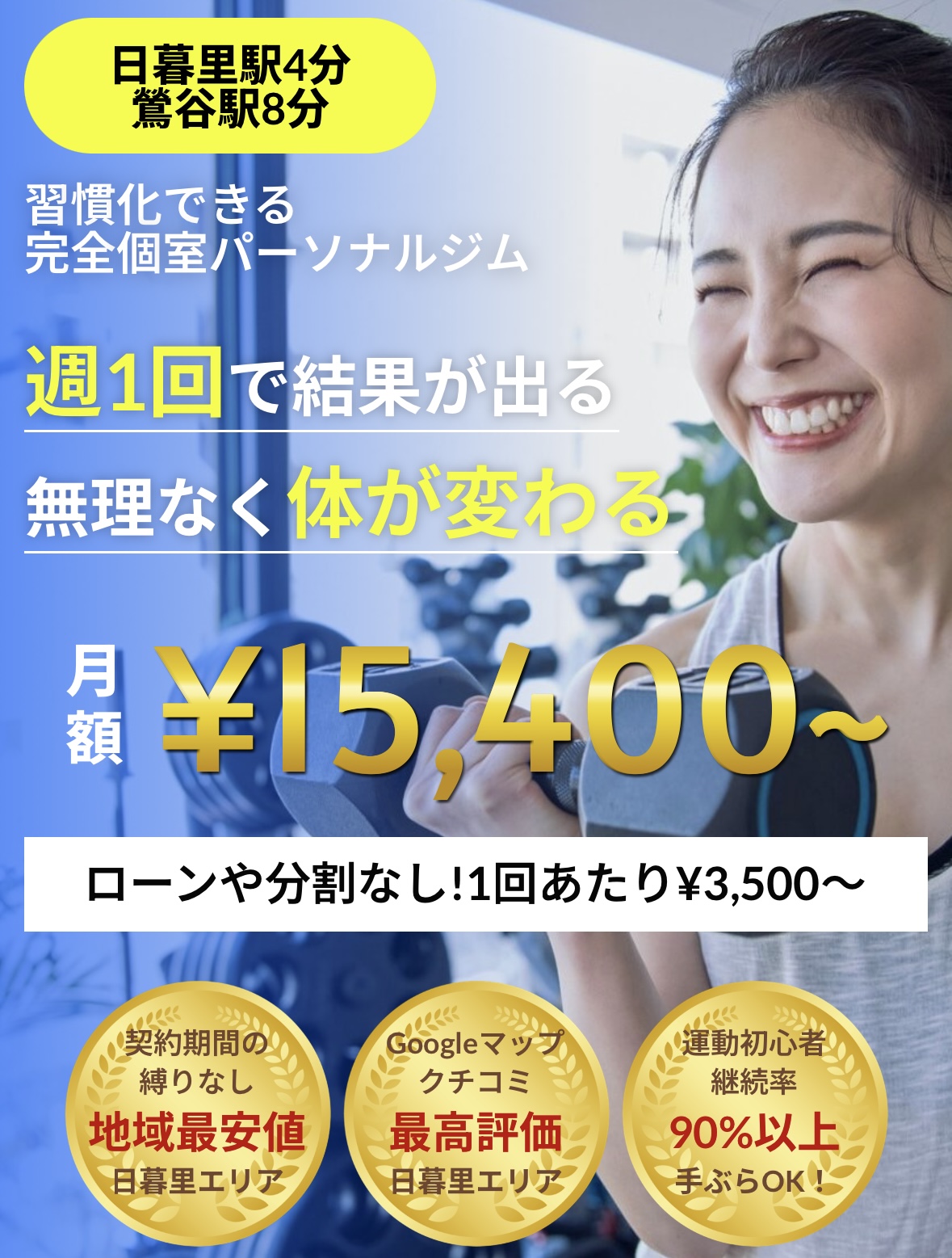 月額¥15,400〜という続けやすさで「続けられるから結果が出る」パーソナルトレーニングジムです! 週1回30分~結果が出るトレーニングプログラムで手軽にパーソナルトレーニングを始められます!