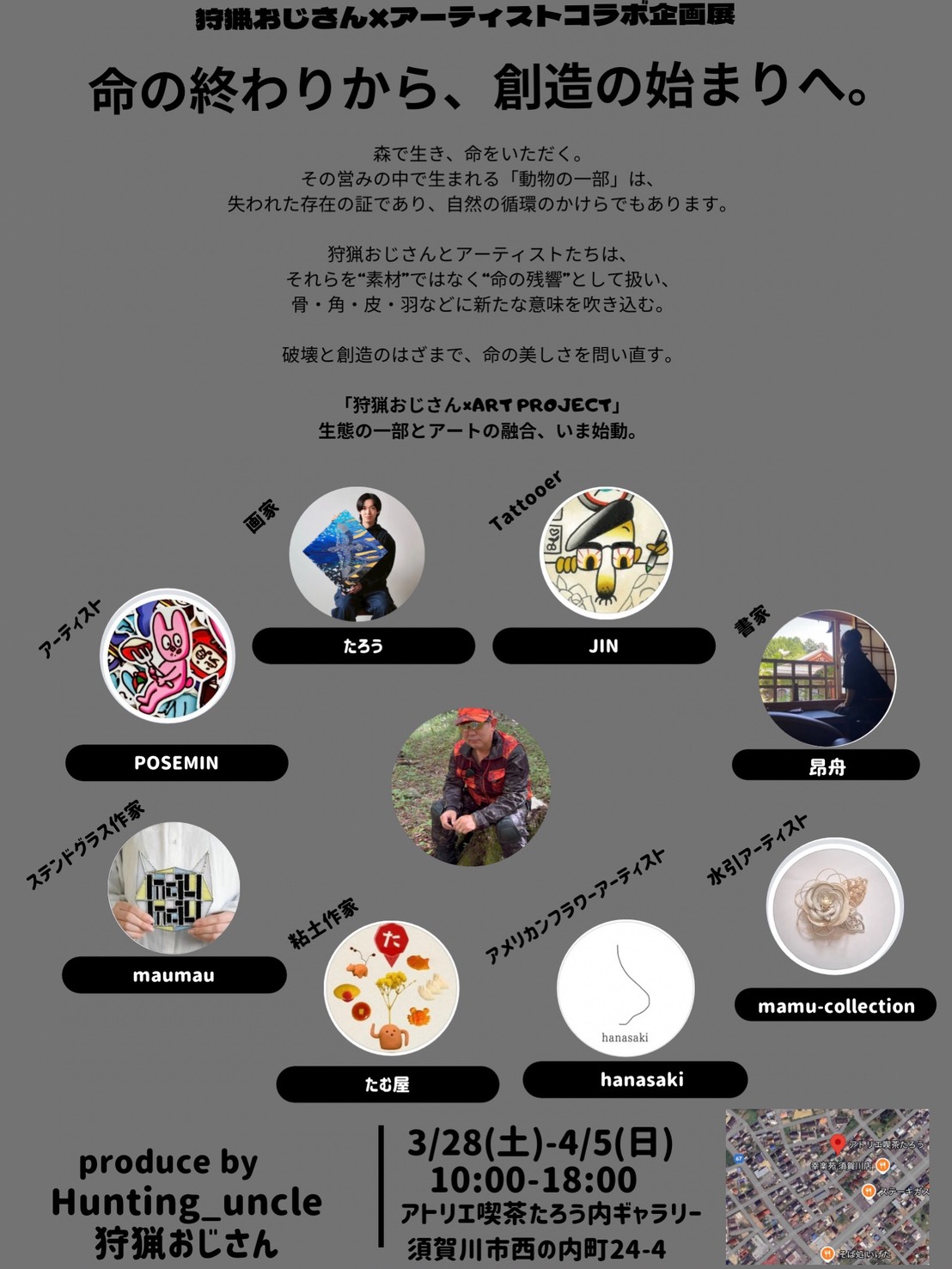 福島県で狩猟をおこないながら、自然との共生やその大切さを広めている、狩猟おじさんこと阿久津勝(屋号:INTEGRATE OFFICE、本拠地:福島県二本松市)が、アーティストコラボ企画展を開催いたします。
