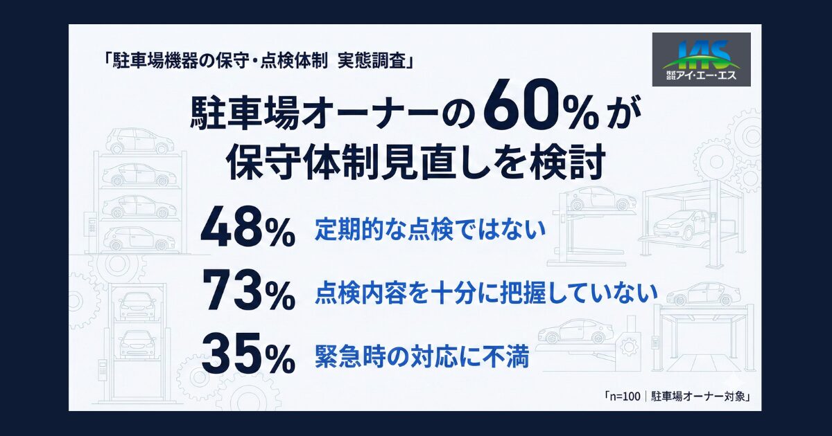 株式会社アイ・エー・エスは、駐車場オーナー100名を対象に「駐車場機器の点検・保守体制に関する実態調査」を実施しました。その結果、60%が今後の保守・点検体制の見直しを検討していることが分かりました。本リリースでは調査の背景と結果を公表します。