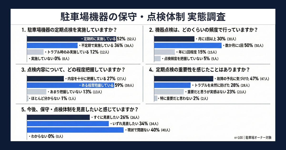 駐車場機器の保守管理は、事故防止や長期安定稼働の観点から重要な役割を担っています。しかし、点検の実施頻度や内容の理解度については、オーナーごとに差があることが想定されます。