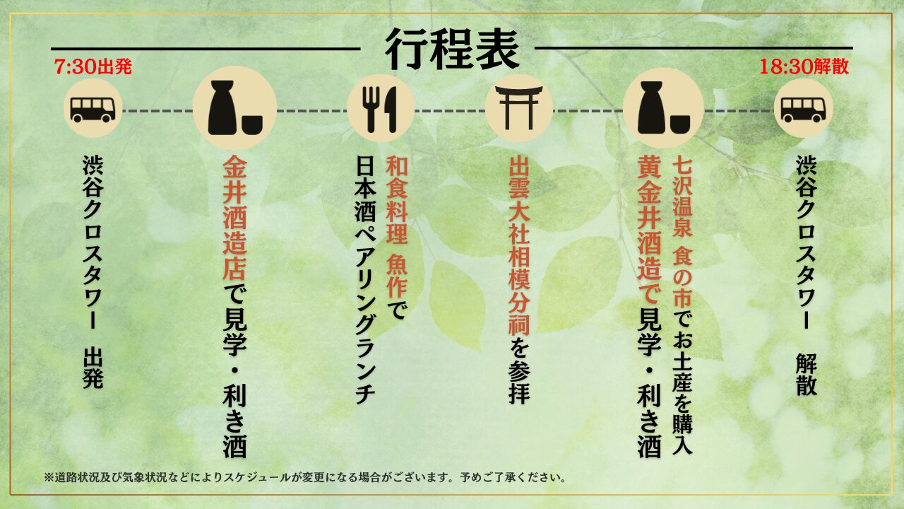 さらに日本酒学講師の資格をもつスタッフも同行し、初心者から愛好家まで安心して楽しめます。