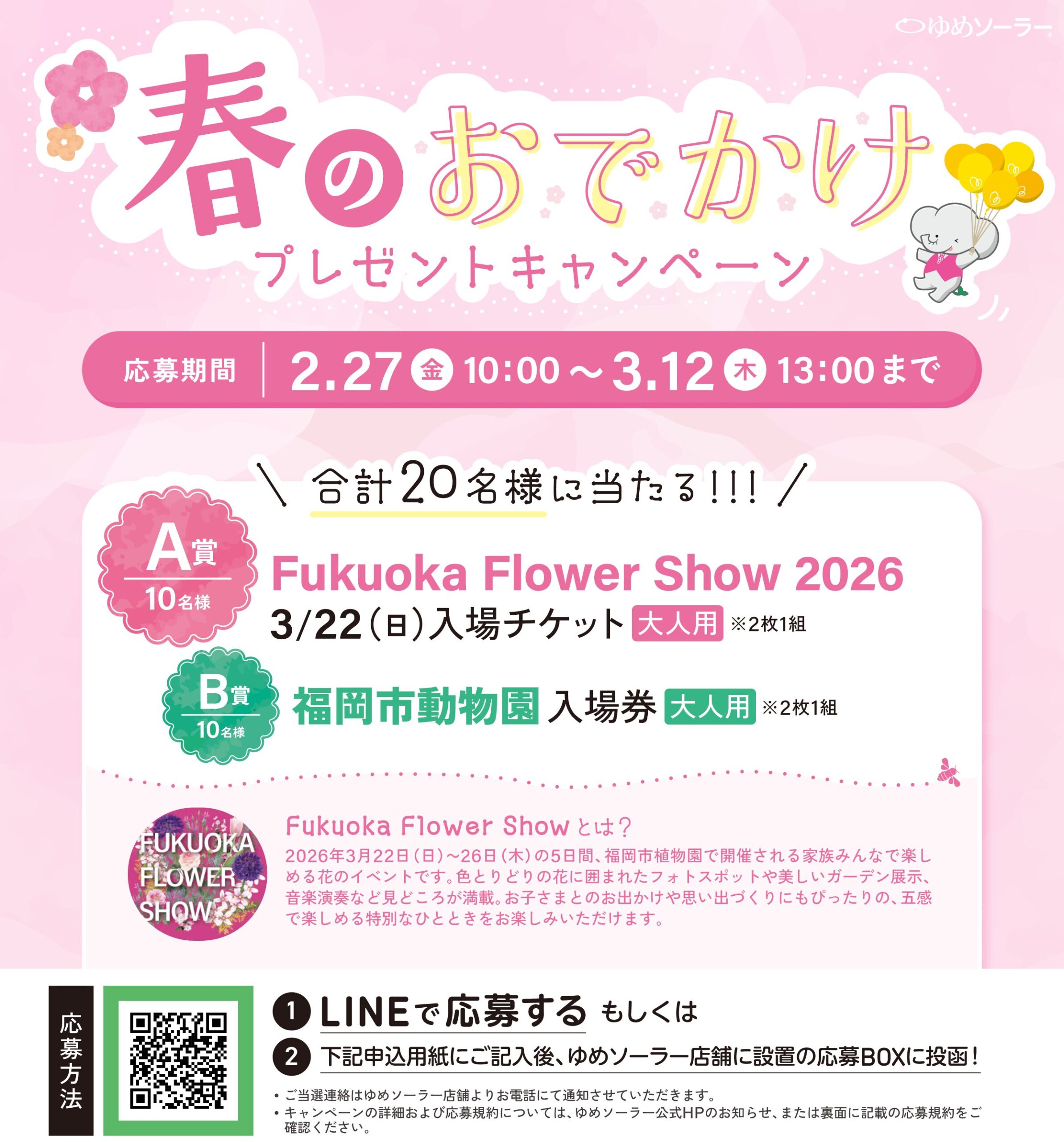ゆめソーラー(本社:福岡県福岡市)はFukuoka Flower Show2026のメンバーシップ登録を記念し、地域の皆さまへ感謝の気持ちを込めて「春のおでかけプレゼントキャンペーン」を実施いたします。