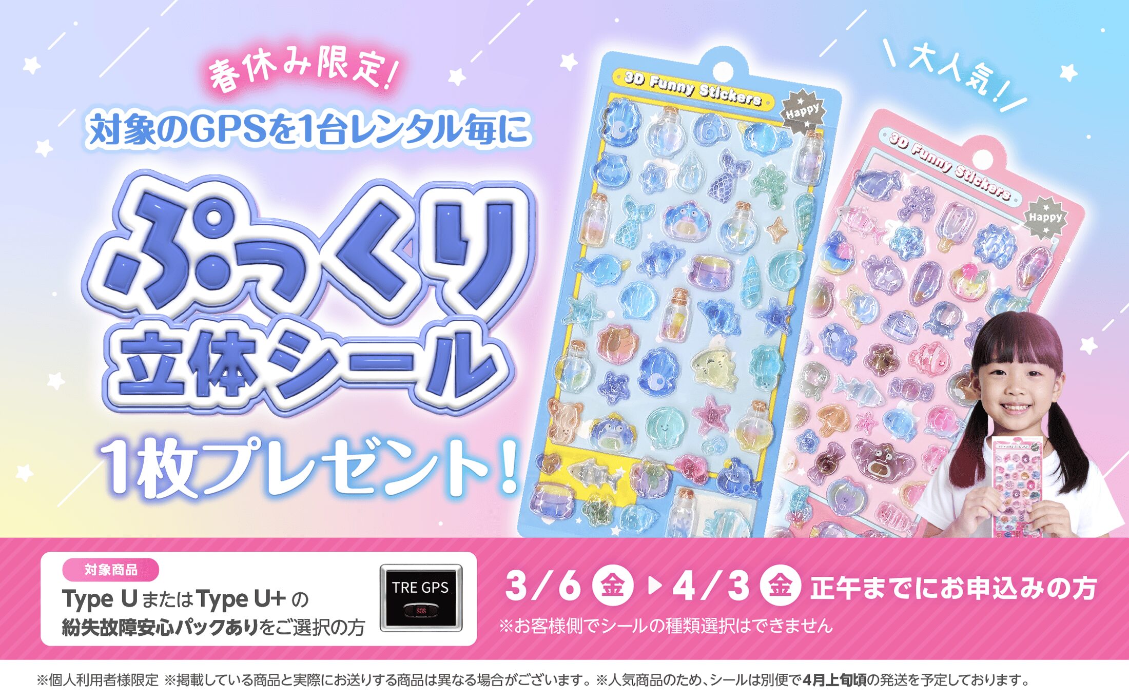 【春休み限定】子供が大喜び!GPSレンタル1台で「ぷっくり立体シール」をプレゼント♪