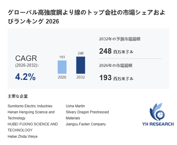 YHResearch調査チームの最新レポート「グローバル高強度鋼より線のトップ会社の市場シェアおよびランキング 2026」によると、2026年の193百万米ドルから2032年には248百万米ドルに成長し、2026年から2032年の間にCAGRは4.2%になると予測されています。