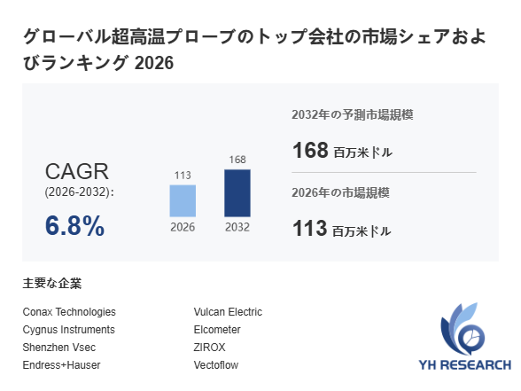 YHResearch調査チームの最新レポート「グローバル超高温プローブのトップ会社の市場シェアおよびランキング 2026」によると、2026年の113百万米ドルから2032年には168百万米ドルに成長し、2026年から2032年の間にCAGRは6.8%になると予測されています。