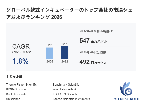 YHResearch調査チームの最新レポート「グローバル乾式インキュベーターのトップ会社の市場シェアおよびランキング 2026」によると、2026年の492百万米ドルから2032年には547百万米ドルに成長し、2026年から2032年の間にCAGRは1.8%になると予測されています。