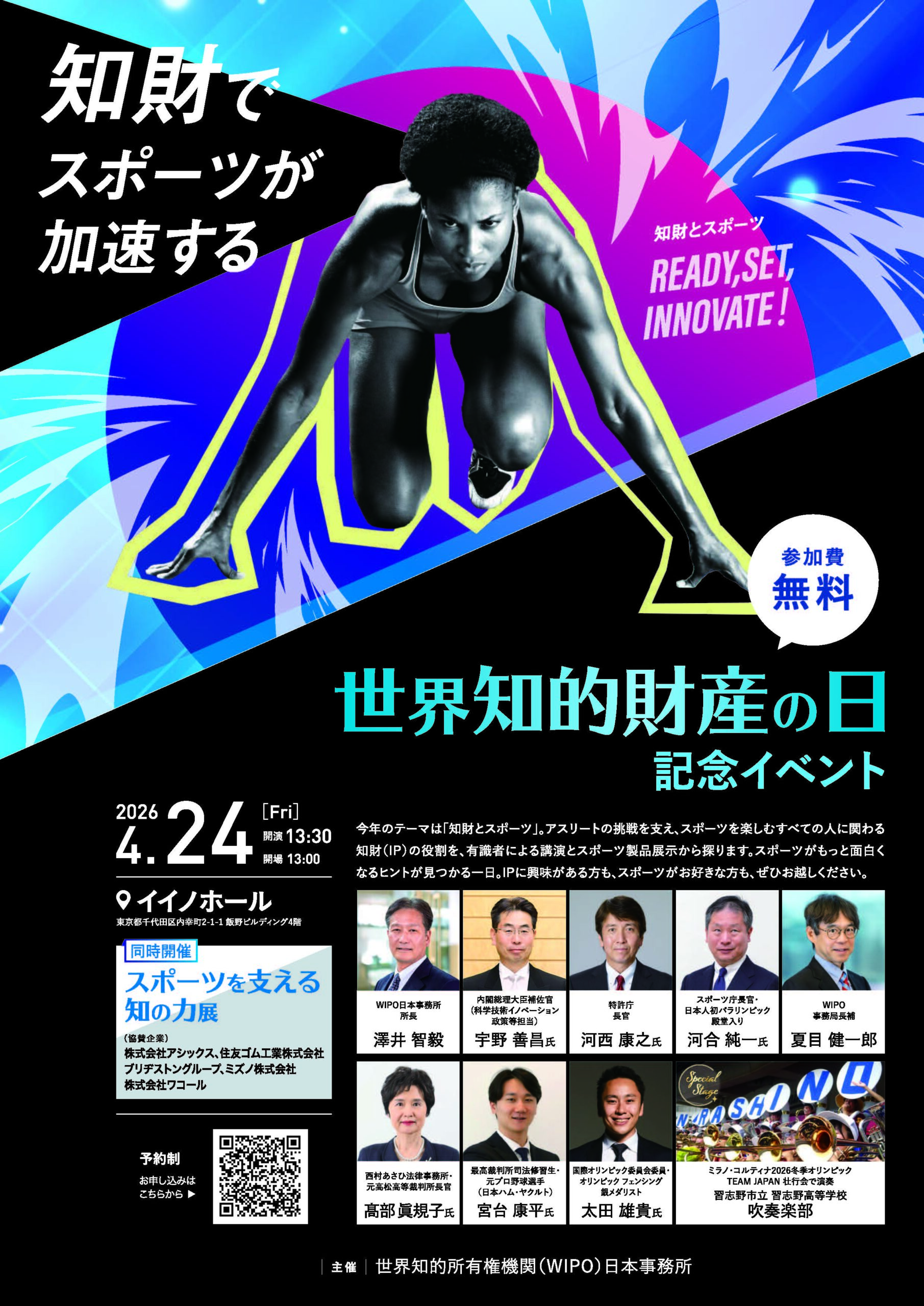国連の専門機関・WIPO日本事務所では、「知財とスポーツ- Ready, Set, Innovate」のもと、世界知的財産の日の記念イベントを2026年4月24日(金)にイイノホール(東京都千代田区)にて開催(参加費無料)いたします!