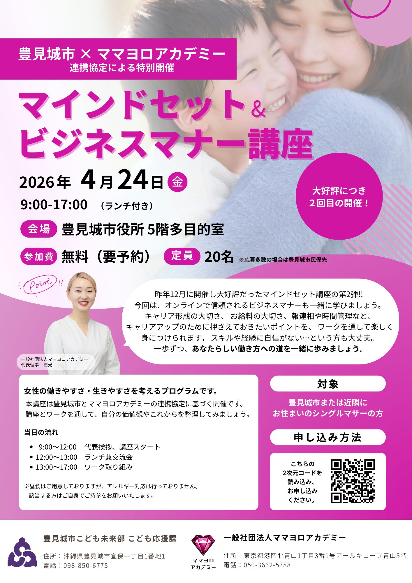 一般社団法人ママヨロアカデミーは、豊見城市との連携協定に基づき、2026年4月24日(金)、豊見城市役所にて「マインドセット&ビジネスマナー講座」を開催する。