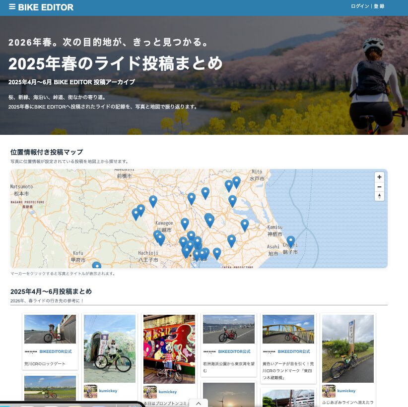 「春のライド投稿まとめ」は、昨年4月から6月にかけて、サイクリストSNS「BIKE EDITOR」に投稿されたサイクリング記録を集約した特設ページです。