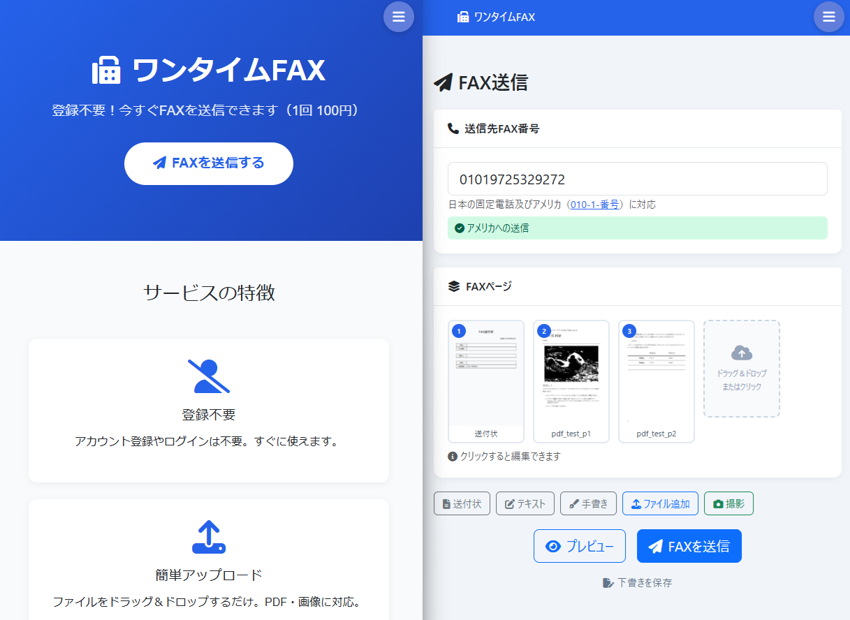 「ワンタイムFAX」は、こうした課題を解決するために開発されたWebサービスです。パソコンやスマートフォンのブラウザから、PDF・画像ファイルのアップロード、テキスト入力、手書き描画、カメラ撮影、送付状作成といった多彩な方法でFAXコンテンツを作成し、日本国内の固定電話番号およびアメリカへの国際FAX送信が可能です。料金は1回100円(税込・最大3ページ)で、Square社の決済基盤によるクレジットカード決済に対応しています。送信に失敗した場合は自動で全額返金される仕組みを採用しており、安心してご利用いただけます。国内全域のみならず、アメリカ合衆国への送信にも対応します。
