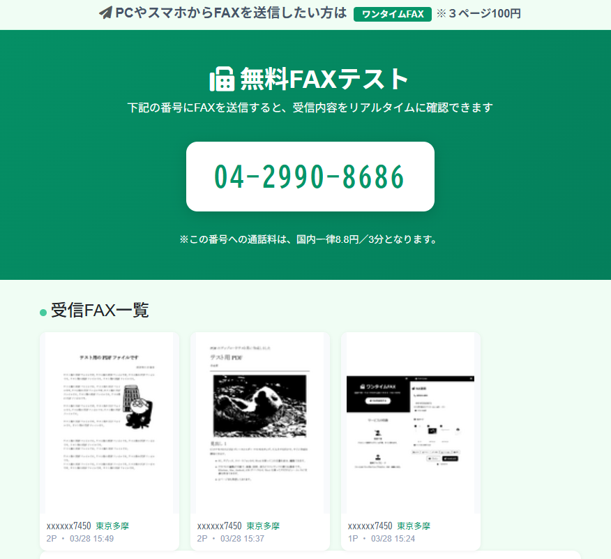当法人では、FAX送信サービス「ワンタイムFAX」(3ページ100円)も運営しており、FAXテストと合わせてFAXに関するワンストップサービスを提供してまいります。