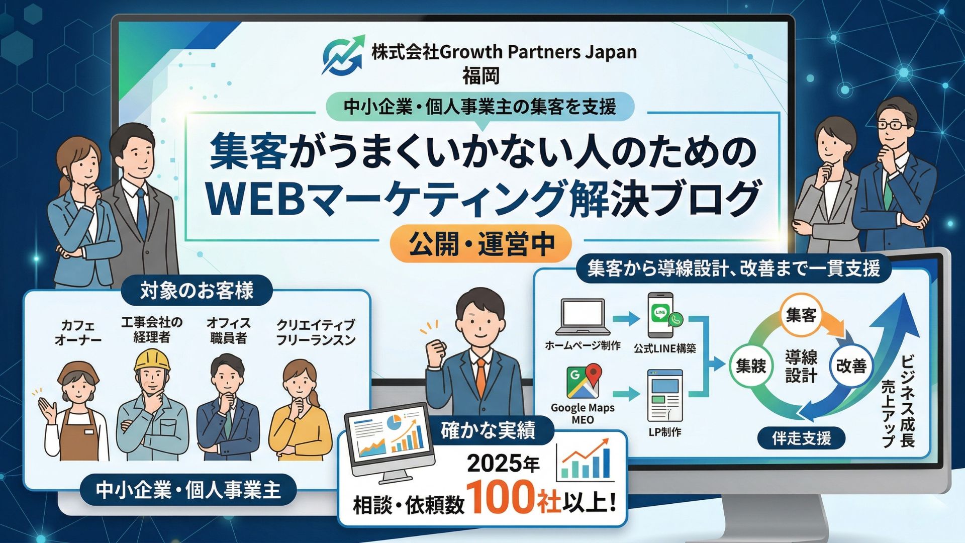 株式会社Growth Partners Japanは、中小企業・個人事業主の集客課題解決を目的としたオウンドメディア「集客がうまくいかない人のためのWEBマーケティング解決ブログ」を公開・運営しています。同社は福岡県福岡市中央区に本社を置き、ホームページ制作、公式LINE構築、Google Maps対策、LP制作などを通じて、集客から導線設計、改善までを一貫して支援しています。公式サイトでは、中小企業・個人事業主の集客導線を設計するマーケティング支援会社であることを明示しており、2025年の相談・依頼数は100社以上と案内しています。今回の情報発信強化は、制作だけで終わらない伴走支援の一環として、事業者が自社集客を見直すための実践知を広く届けることを目的としています。