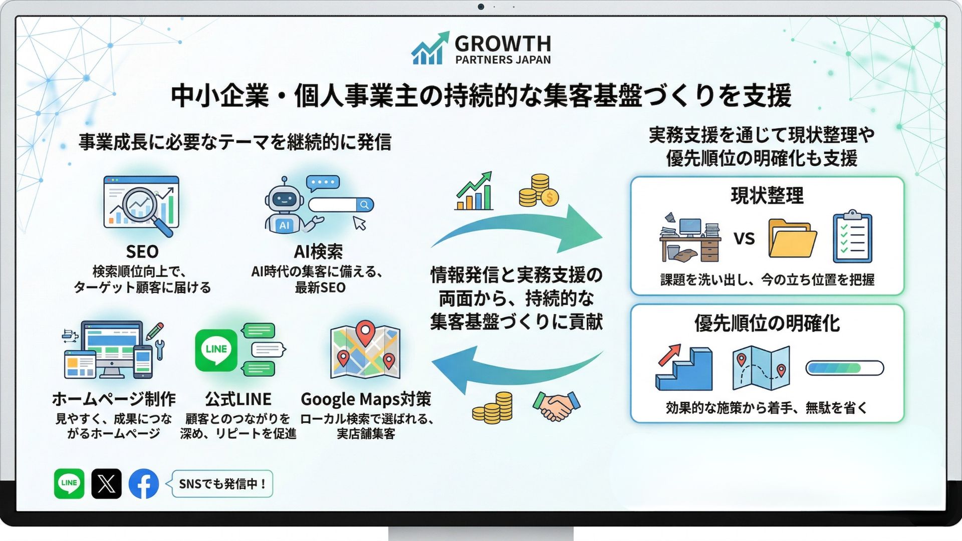 株式会社Growth Partners Japanは、中小企業・個人事業主向けに、SEO、AI検索、ホームページ設計、公式LINE活用など、集客から導線改善までを実務ベースで発信するオウンドメディアを公開・運営しています。