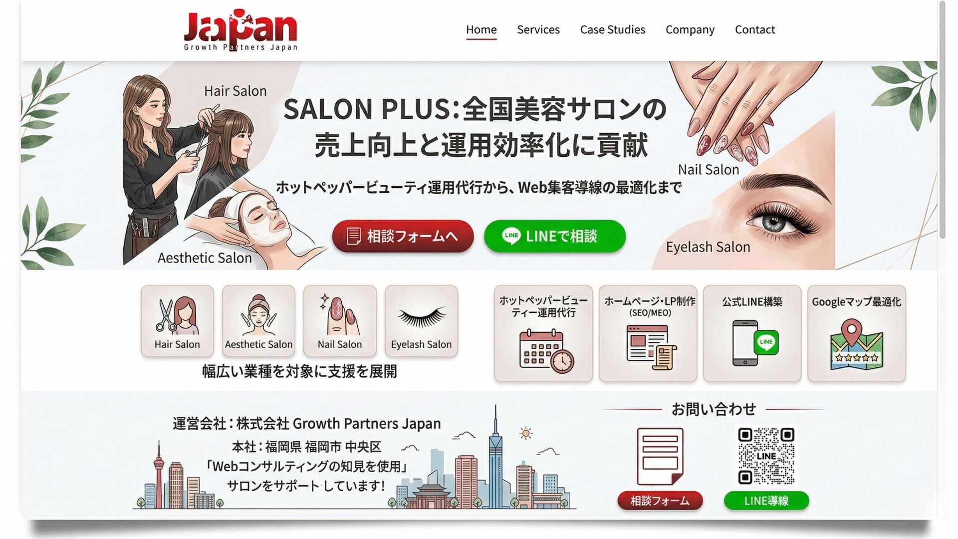 運営会社である株式会社Growth Partners Japanは、福岡県福岡市中央区に本社を置き、Webコンサルティング事業、ホームページ・LP制作、公式LINE構築、Googleマップ最適化なども手がけています。SALON PLUSでは、こうした知見を活かし、美容室、エステサロン、ネイルサロン、まつエクサロンなど幅広い業種を対象に支援を展開しています。今後も同社は、ホットペッパービューティー運用代行に加え、Web集客導線の最適化や改善提案を通じて、全国の美容サロンの売上向上と運用効率化に貢献していく方針です。問い合わせはサイト上の相談フォームおよびLINE導線から受け付けています。