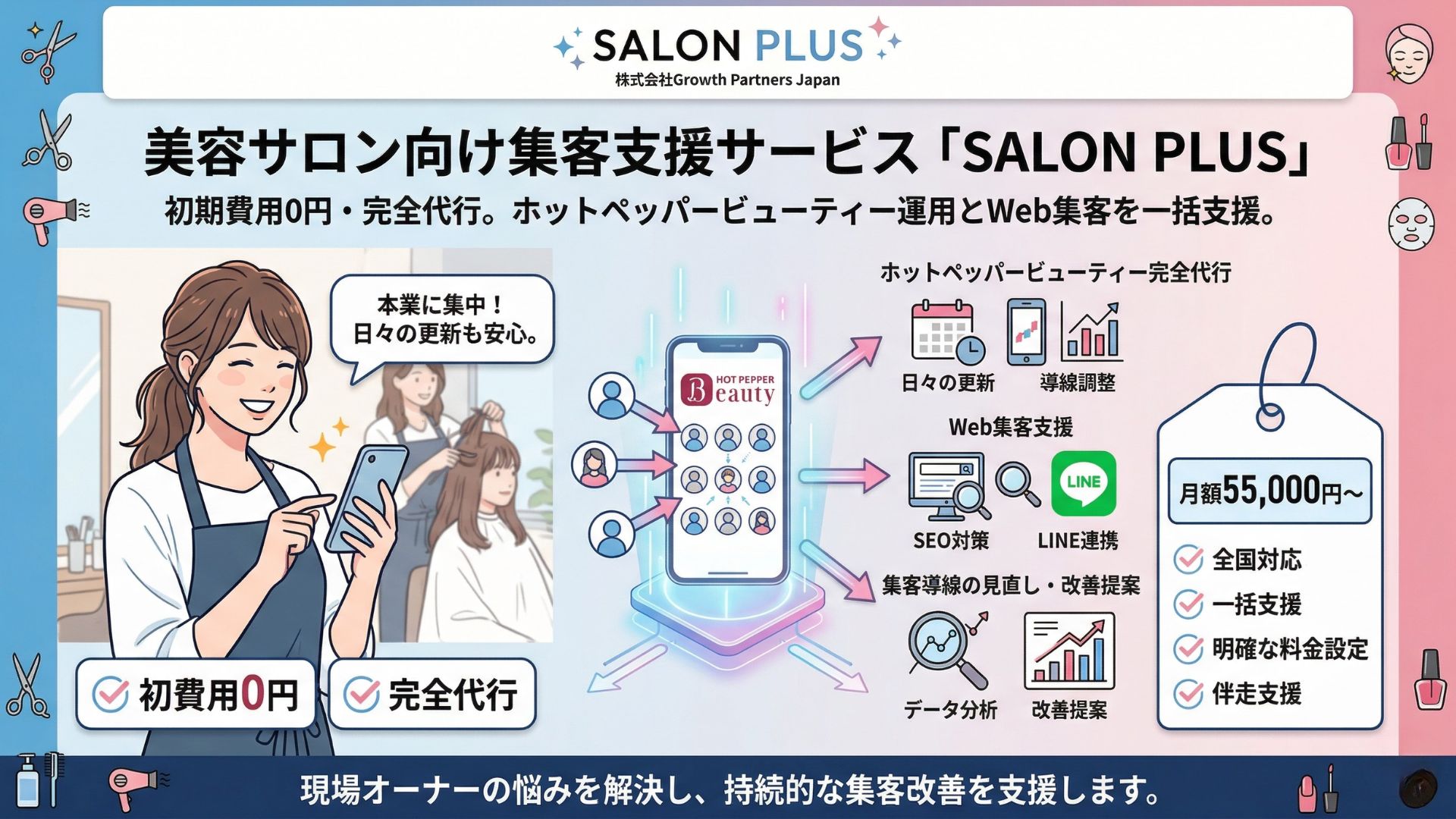 株式会社Growth Partners Japanは、美容サロン向けホットペッパービューティー運用代行サービス「SALON PLUS」を展開しています。集客設計、LINE連携、SEO、改善提案まで一括で支援し、サロンの売上向上と運用負担の軽減を目指します。