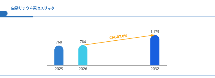 Global Reports調査チームの最新レポート「グローバル自動リチウム電池スリッター市場規模、主要企業シェア、ランキング分析レポート【2026年版】」によると、2026年の784百万米ドルから2032年には1179百万米ドルに成長し、2026年から2032年の間にCAGRは7.0%になると予測されています。