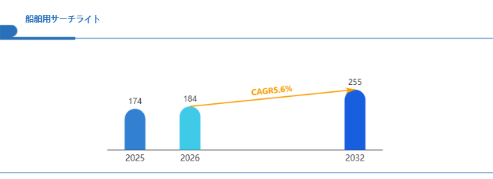 Global Reports調査チームの最新レポート「グローバル船舶用サーチライト市場規模、主要企業シェア、ランキング分析レポート【2026年版】」によると、2026年の184百万米ドルから2032年には255百万米ドルに成長し、2026年から2032年の間にCAGRは5.6%になると予測されています。