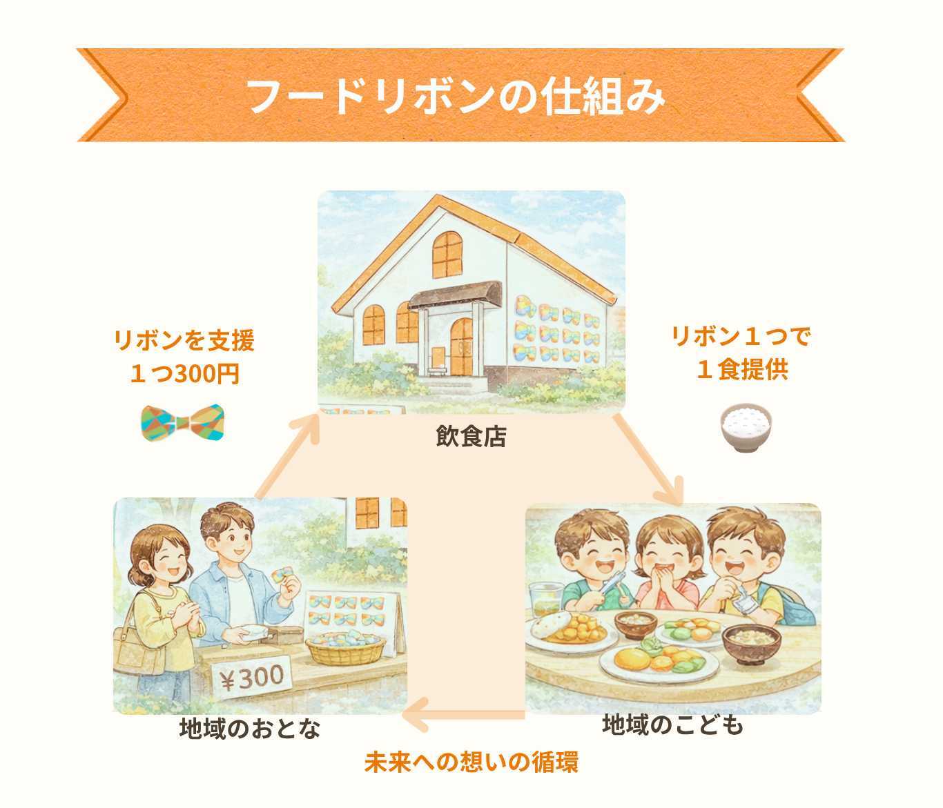 フードリボンは、地域の飲食店を通じて子どもたちの「今日の一食」を支える仕組みです。