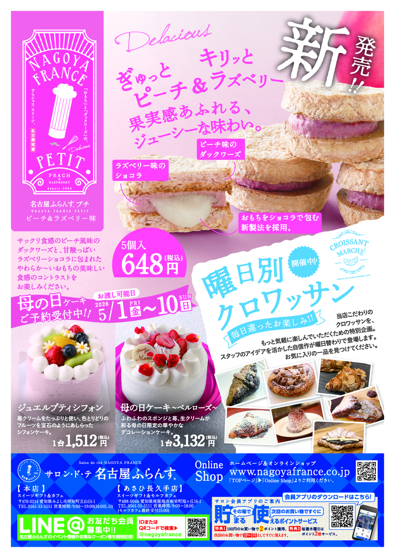 名古屋フランスcorp株式会社(愛知県豊田市)は、ゴールデンウィーク期間中、直営店舗「サロン・ド・テ 名古屋ふらんす」にて“おいしい+楽しい”をテーマにした体験型イベントを開催いたします。期間中は、お子さまから大人まで楽しめる参加型企画として、「ダックワーズ・タワー積みゲーム」や「お菓子詰め放題」を実施。さらに、母の日に向けた限定ケーキやギフトも展開し、家族で楽しめるスイーツ体験をご提案します。