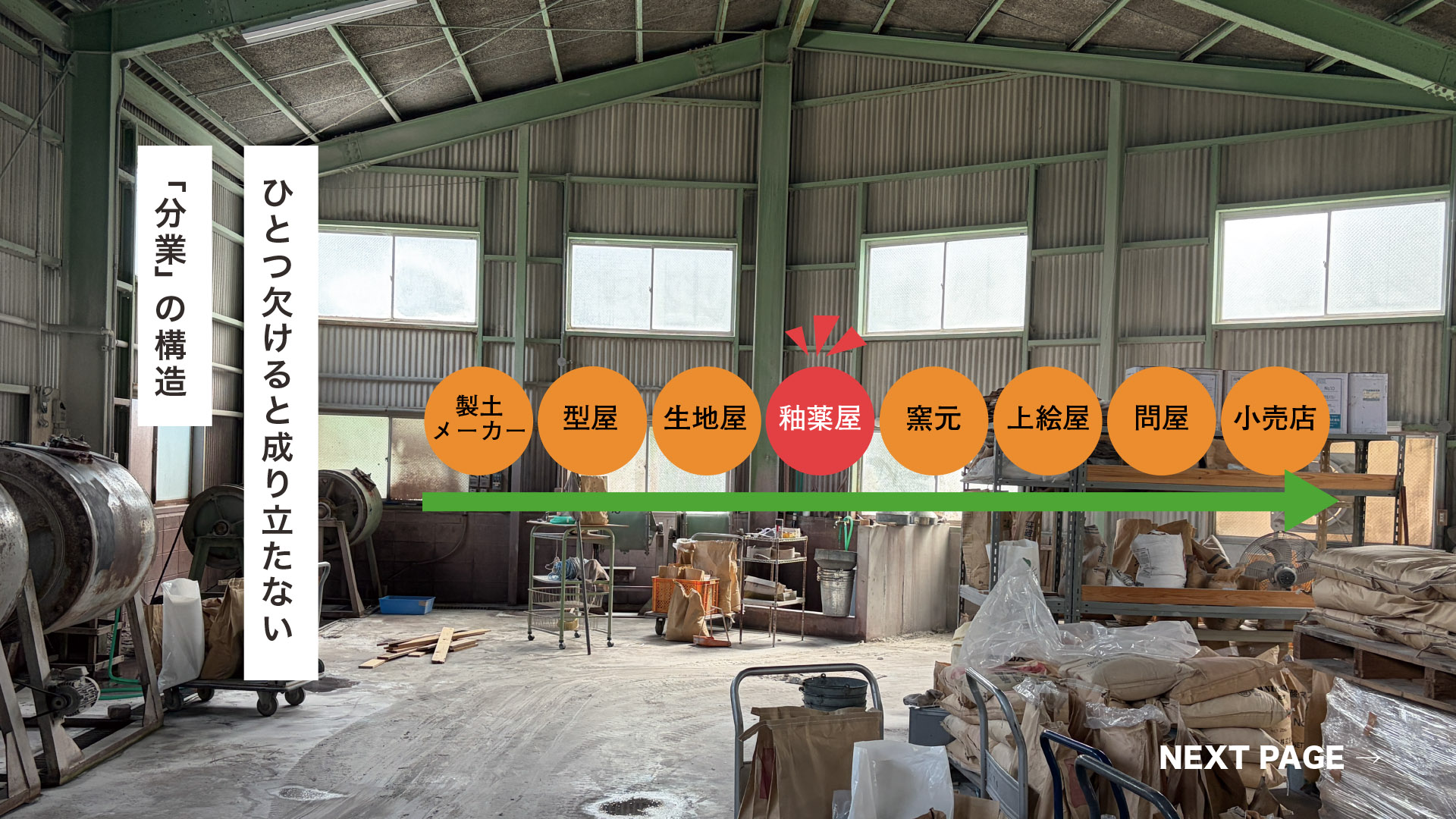 表舞台に出ることのない、しかし産地にとって不可欠な「中間工程」の重要性を広く伝える。釉薬製造の様な裏方の技術に光を当て、その価値を再認識する機会とする。