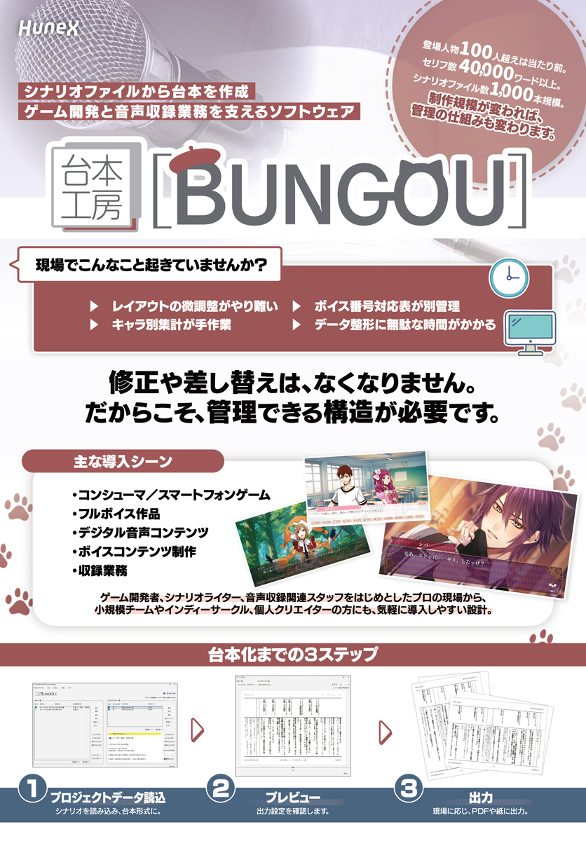 『台本工房[BUNGOU]』は、ゲーム開発や音声ドラマ制作などの音声収録を伴う制作現場で、シナリオテキストから収録用台本やボイス管理表を作成できるWindows向け業務用ソフトです。