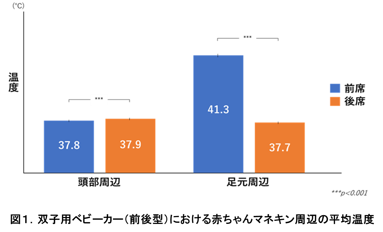 ・前後式ベビーカーでの真夏の移動において、前席の足元は後席に比べて4℃近く暑くなる。