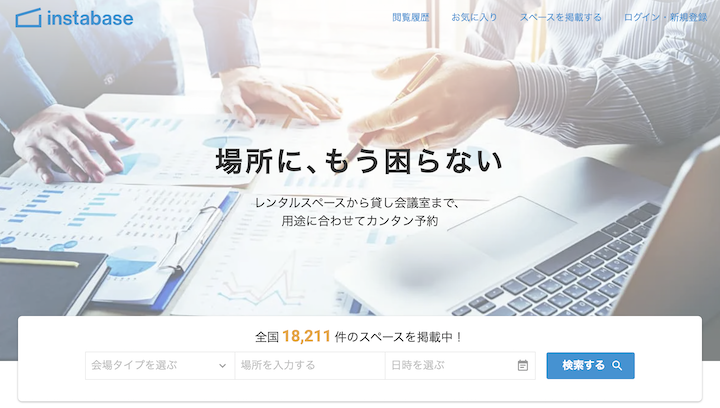インスタベースは、全国18,000件以上のレンタルスペースをサイト上で簡単・便利に予約できるサービスです。
